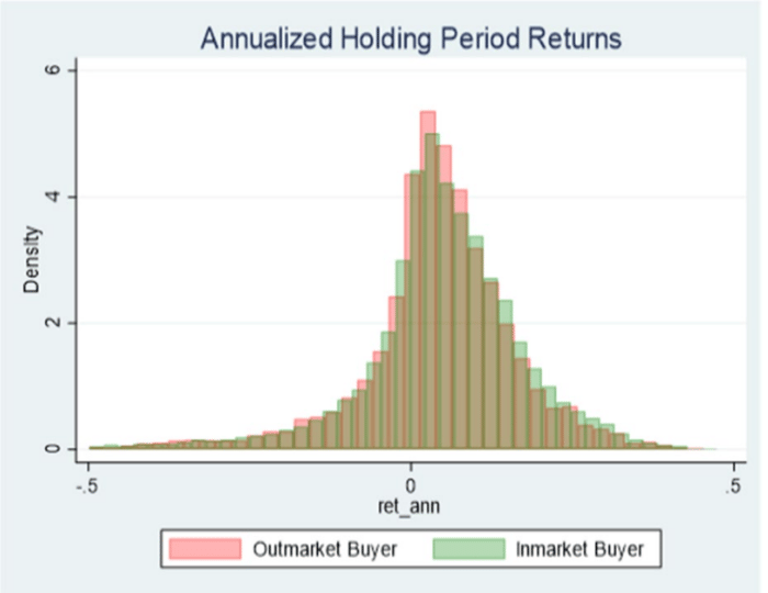 So how does this show up in the returns? Unsurprisingly, across all transactions, if a buyer creates a high return for the seller, that buyer “is likely to have a lower return when they sell.” And as noted, since out-of-market buyers more often provide those strong exits, locals tend to outperform. That suggests local buyers should on average perform better. And the returns data supports the theory that such an edge exists: In-market buyers, on average, see higher returns than out-of-market buyers. The difference is small but persistent, reflected in the small rightward skew of the green bars below.