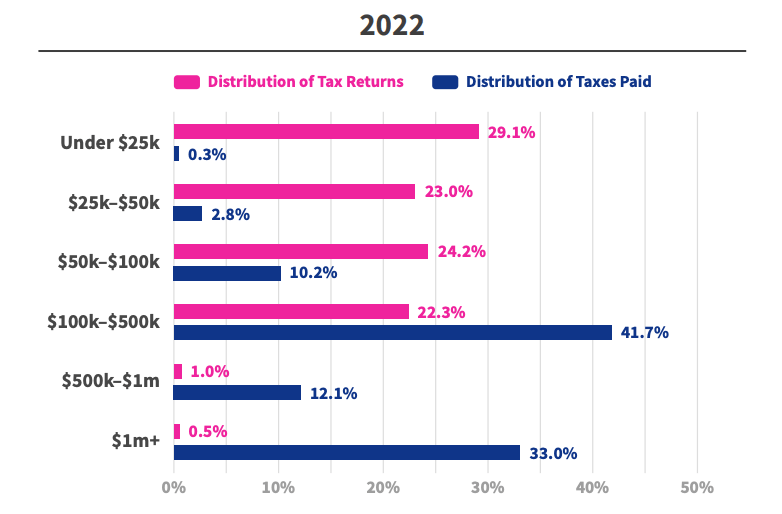 People earning higher incomes pay progressively more as a percentage of their income, but how progressive is it? From what groups of workers does the government actually collect the most tax? Consider this: In 2022 52% of all tax returns come from households making less than $50,000 per year and they account for 3% of total tax revenue. On the flip side, one-third of all income tax revenue comes from the 0.5% of households filing returns showing more than $1 million of income.
